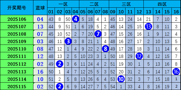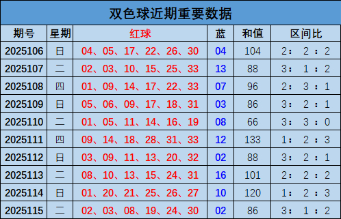 上期蓝球开出偶数号码02。近期奇偶球比值3:7,偶数球走势上升,本期看好偶数球热出,推荐号码06。