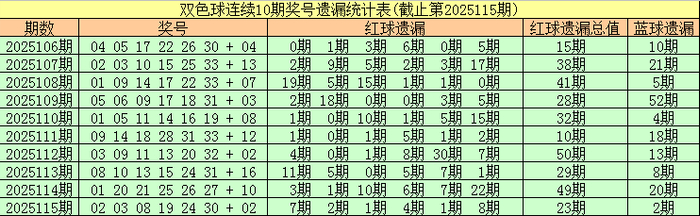 安队第2025116期双色球遗漏分析:(热码:遗漏0-3期,温码遗漏4-9期,冷码遗漏10期及以上)